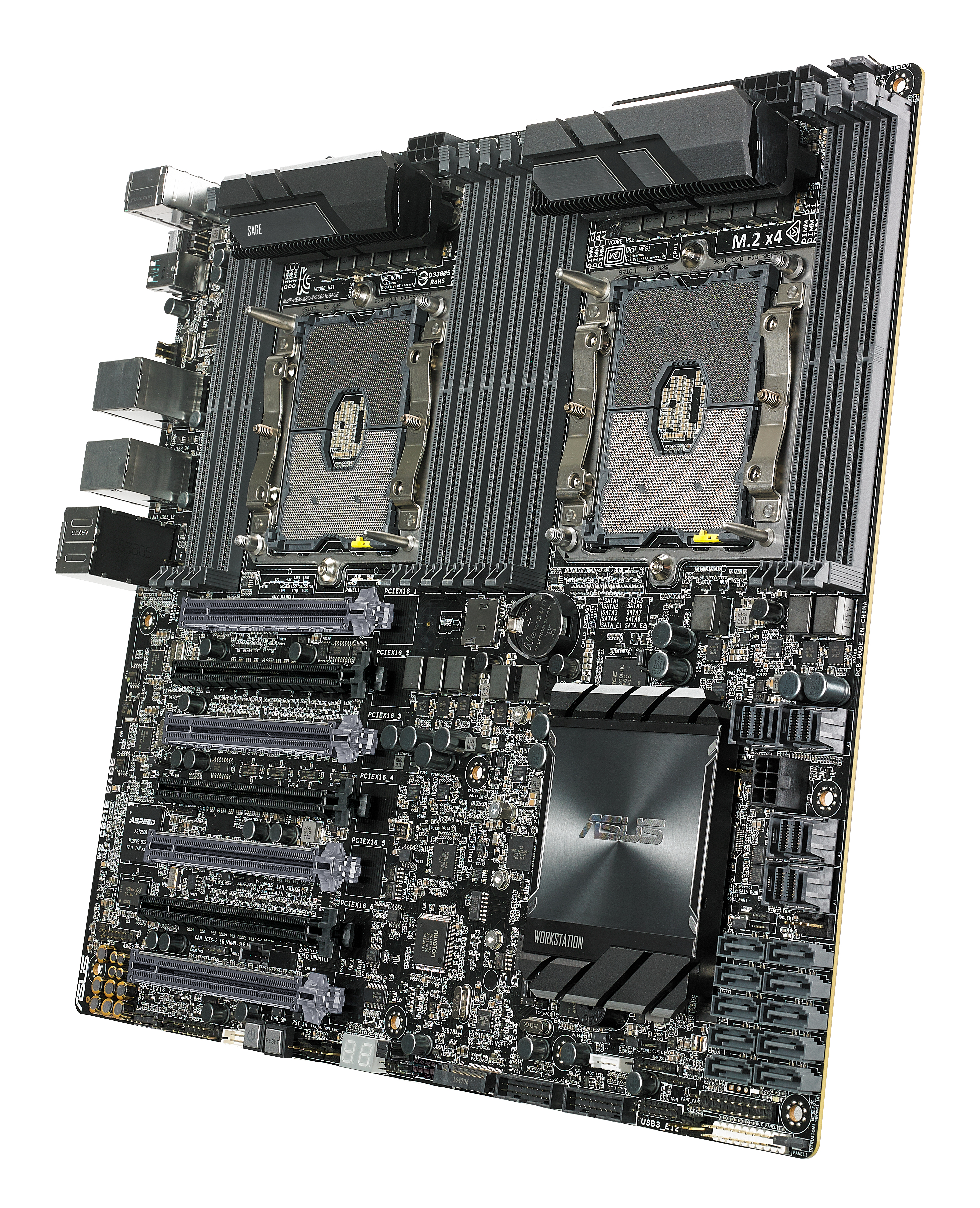 Konfigurationen mit bis zu vier Grafikkarten Das ASUS WS C621E SAGE bietet Platz für bis zu vier doppelt breite Grafikkarten mit vier echten PCIe Gen3 x16-Links für maximale Grafikleistung. Mit der Unterstützung von bis zu vierfachem NVIDIA® SLI™ und AMD CrossFireX™ oder alternativ zweifachem NVIDIA Quadro™ SLI™ ist das WS C621E SAGE eine ausgezeichnete Wahl für Content-Ersteller, Maschinenbau- und Architekturingenieure sowie für alle, die mit rechenintensiven Aufgaben tun haben. Durch die Übertaktung beider Intel®-Xeon™-CPUs bricht die Rechenleistung alle Rekorde Das ASUS WS C621E SAGE überwindet Leistungsgrenzen, indem es die Übertaktung von zwei Xeon™-CPUs ermöglicht. Mit seinem einzigartigen BIOS-Mechanismus zur Steigerung der CPU-Leistung ist das WS C621E SAGE in der Lage, eine unglaubliche Systemgeschwindigkeit zu liefern. Unterstützung von bis zu 12 DDR4-Speichermodulen mit ECC-Fehlerkorrektur Gewährleistet, dass das System auch bei der Ausführung mehrerer Hardware-intensiver Programme mit hoher Geschwindigkeit arbeitet Das ASUS WS C621E SAGE unterstützt bis zu 12 DDR4-Speichermodule mit ECC-Fehlerkorrektur, um eine schnelle und zuverlässige Systemleistung zu gewährleisten, selbst wenn mehrere speicherintensive Anwendungen gleichzeitig ausgeführt werden – wie beispielsweise Video-, Audio- und Bildbearbeitungsprogramme. Blitzschnelle Speichergeschwindigkeit mit NVMe PCIe SSD RAID 0 Das ASUS WS C621E SAGE unterstützt mehrere NVMe PCIe-Speichergeräte in einer RAID-0-Konfiguration und ermöglicht extrem hohe Datenübertragungsraten, die weit über die von einzelnen Laufwerken hinausgehen. Superschnelle Übertragungsgeschwindigkeiten von bis zu 32 Gbit/s mit vier integrierten M.2- und U.2-Schnittstellen Das ASUS WS C621E SAGE ist mit integrierten M.2- und U.2-Anschlüssen ausgestattet, die sowohl 2,5-Zoll-NVMe- als auch M.2-SSDs aufnehmen können. Durch die Nutzung der maximalen PCIe-Gen3.0-x4-Bandbreite von 32Gbit/s ermöglicht das WS C621E SAGE Datenübertragungsraten die bis zu 5,3 mal höher sind, als die herkömmlicher Speichergeräte. Exklusive Audio-Features mit Realtek®-Codec und einzigartigen Funktionen für einen unverfälschten und leistungsstarken Klang. Das ASUS WS C621E SAGE nutzt einen einzigartigen Audio-Codec, der in Zusammenarbeit mit Realtek® entwickelt wurde. Für einen makellosen Klang verfügt der Realtek® S1220A über einen nie dagewesenen Signal-Rauschabstand (SNR) von 120dB und der Line-In über einen SNR von 113dB