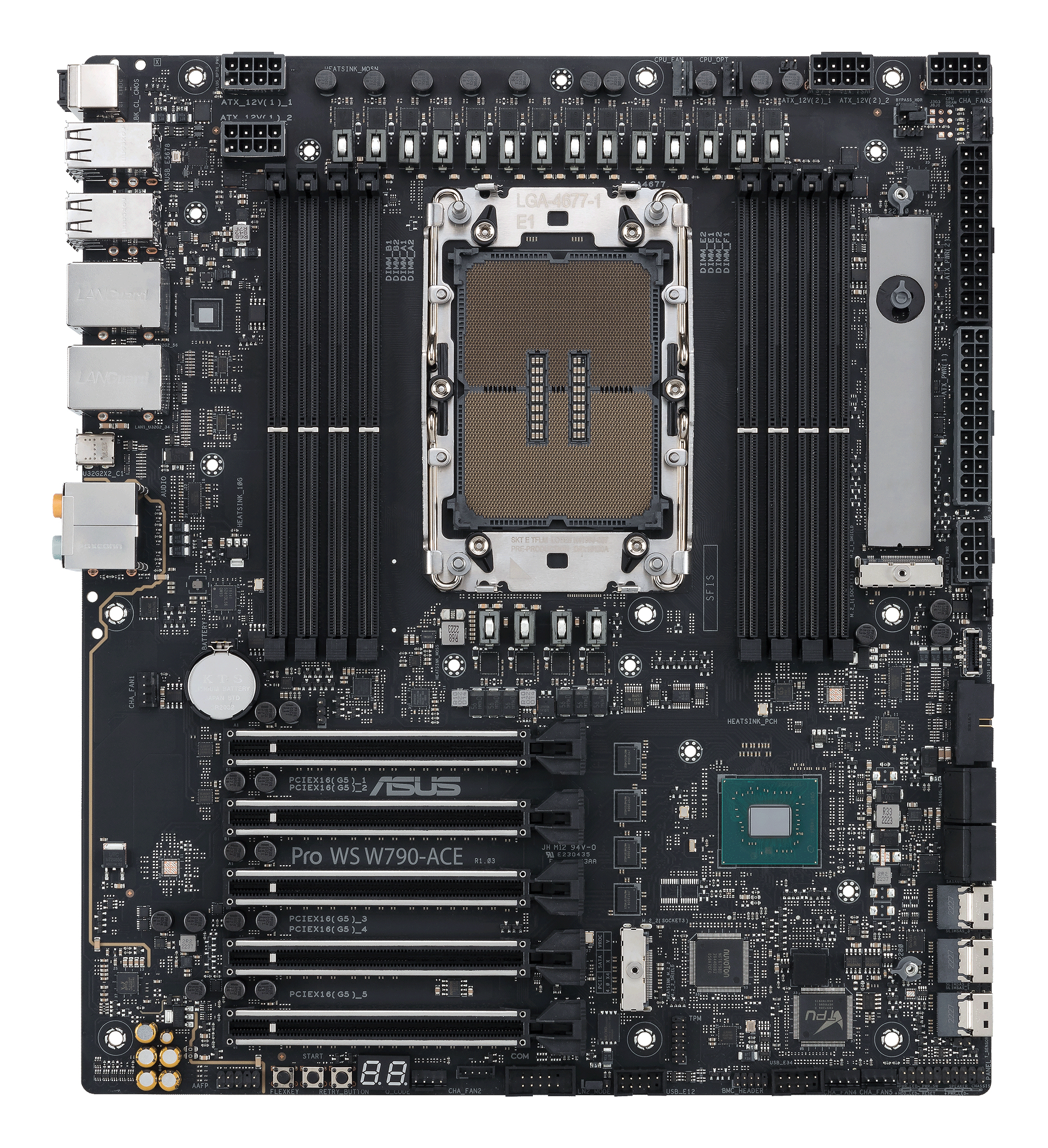 Intel® W790 (LGA 4677) CEB Workstation-Mainboard, PCIe® 5.0 x16, M.2, 10G und 2.5G LAN, Fernverwaltung auf Server-Niveau, 12+1+1 Power Stages, Front- und rückseitige USB 3.2 Gen 2x2 Typ-C® USB 3.2 Gen 2x2 Typ-C®-Anschlüsse Leistungsstark, Produktiv, Geprüft Das Workstation-Mainboard der Pro WS W790-Serie wurde speziell für Kreativprofis, Entwickler und Ingenieure entwickelt. Es entfesselt die dominante Leistung der neuesten Intel® Xeon®-Prozessoren und bietet die Möglichkeit zur CPU- und Speicherübertaktung. Mit einem optimierten Speicherlayout, einem fortschrittlichen Design der Power Stages, IPMI-Fernverwaltung in Serverqualität und ultraschneller PCIe® 5.0- und Netzwerkkonnektivität verbindet die Pro WS W790 Serie kompromisslose Technik mit einer unglaublichen Ästhetik. Die ASUS W790 Mainboards gehen mit einer sorgfältig gepflegten Sammlung von Hardware-Validierungen über das Übliche hinaus, um sicherzustellen, dass Ihre Workstation eine Vielzahl von Speicher, Kühler, Gehäuse, Netzteil und anderen Geräten unterstützt. FUNKTIONAL UND ÄSTHETISCH Unauffällig und Professionell Mit schwarzen Aluminiumprofilen, schwarzem Edelstahl-Mesh mit hervorgehobenen Details und einer transparenten, rauchgrauen Anschluss-Abdeckung bietet das Pro WS W790-ACE einen professionellen, unauffälligen Look für die Erstellung von Inhalten. Multi-GPU-Unterstützung Das Pro WS W790-ACE verfügt über fünf PCIe® 5.0 x16-Steckplätze für leistungsstarke Grafikkarten, die eine verbesserte Leistung für professionelle Design-, Modellierungs-, Simulations- und Rendering-Anwendungen ermöglichen. ROBUSTE STROMVERSORGUNG 12+1+1 Power Stages Das VRM des Pro WS W790-ACE besteht aus 12+1+1 Power Stages und liefert die Leistung und Effizienz, die die neuesten Intel®-Prozessoren erfordern. 8-poliger Stromanschluss Ein zusätzlicher 8-poliger PCIe®-Stromanschluss kann die Stabilität der Stromversorgung erhöhen, wenn Kreative und Entwickler mehrere Grafikkarten verwenden. Verlässlichkeit mit höchster Speicherübertaktung Das Pro WS W790-ACE unterstützt 4-Kanal 2DPC DDR5 RDIMM ECC-Speicher, wodurch Datenfehler automatisch erkannt und korrigiert werden können, was das Risiko von Systemabstürzen verringert. Dank des durchdachten Trace-Layouts für den Speicher ermöglicht dieses Mainboard die Übertaktung von DDR5-Speicher mit maximalen Geschwindigkeiten, um eine bessere Speicherleistung für eine Vielzahl von Workloads zu bieten. ULTRASCHNELLE KONNEKTIVITÄT ALS ANTRIEB FÜR IHRE KREATIVITÄT 10G & 2.5G Ethernet Ein Marvell® AQC113CS 10G-Ethernet-Anschluss ist bereit für Network Attached Storage (NAS) und ein Intel® I226-LM 2.5G-Ethernet-Anschluss ist bereit für Streaming oder Dateiupload. USB 3.2 Gen 2x2 Typ-C® Der neueste USB-Standard verdoppelt die Übertragungsbandbreite, indem er eine zweite USB 3.2-Lane nutzt und einen maximalen Durchsatz von bis zu 20 Gbit/s erreicht. Zusätzlich zu den rasend schnellen Datenübertragungsgeschwindigkeiten bietet USB 3.2 über die USB-C-Anschlüsse einfache Konnektivität und ultimative Flexibilität. Zwei M.2 Das Pro WS W790-ACE verfügt über zwei M.2 Slots, die per PCIe® 4.0-Bandbreite angebunden sind. Creator, die mit großen Videodateien arbeiten, können mehrere NVMe™-Laufwerke in einem RAID-Verbund zusammenschließen, um eine enorme I/O-Bandbreite und eine nahtlose Wiedergabe in ihren Schnittplätzen zu erreichen. Zwei dieser M.2-Steckplätze befinden sich unter speziellen Kühlkörpern, um das Throttling von SSDs bei hoher Belastung zu verhindern, und sie verfügen über ASUS Q-Latch für den einfachen Einbau und Austausch von Laufwerken. Mehr Speicher Um noch mehr Hochgeschwindigkeitsspeicher anzuschließen, können Sie mit den integrierten SlimSAS-Steckplätzen über die schnelle PCIe® 4.0/PCIe® 3.0-Schnittstelle industrielle SSDs anschließen - ganz zu schweigen von Server- und Netzwerkgeräten. Frontpanel-Anschluss Der USB 3.2 Gen 2x2-Frontpanel-Anschluss ist bereit für PC-Gehäuse und Geräte der nächsten Generation. REMOTE MANAGEMENT AUF SERVER NIVEAU Remote Management Ability Dieses Mainboard unterstützt die Fernverwaltung mit der ASUS IPMI-Erweiterungskarte und bietet damit Vorteile für Anwendungen, die leistungsstarke Systeme erfordern, aber dennoch eine ausreichende Fernüberwachung des Systemstatus und die Möglichkeit der Fehlerbehebung in Echtzeit bieten. Administratoren können aus der Ferne mit Client-Geräten kommunizieren, um bestimmte Korrekturmaßnahmen zu ergreifen, wie z.B. das Zurücksetzen oder Ausschalten eines Systems. ASUS Control Center Express Das Pro WS W790-ACE wird mit ASUS Control Center Express ausgeliefert - einer Echtzeit-IT-Überwachungs- und Verwaltungssoftware für Unternehmen, die die Produktivität verbessert und die Sicherheit erhöht, indem sie unbefugten Zugriff und Datenlecks verhindert. UMFASSENDES KÜHLUNGS DESIGN Massive VRM-Kühlkörper Da Masse und Luftstrom von entscheidender Bedeutung sind, werden unsere VRM-Kühlkörper mit hohen und dicht gepackten Lamellen gefertigt und auf den MOSFETs und Drosseln platziert, um die thermische Effizienz zu verbessern. Chipsatz-Kühlkörper Ein spezieller und kräftiger Chipsatz-Kühlkörper leitet die Wärme ab und sorgt so für optimale Betriebstemperaturen. M.2 Kühlkörper Zwei M.2-Steckplätze sind von Kühlkörpern abgedeckt, um temperaturbedingtes Throttling zu verhindern, das die Leistung bei hoher, anhaltender Speicherbelastung beeinträchtigen kann. M.2-Backplate-Blöcke auf ausgewählten Steckplätzen gehen sogar noch weiter, um sicherzustellen, dass Sie Spitzenleistung von Ihren Next-Gen-Laufwerken erhalten. DIY-FREUNDLICH Vormontiertes I/O Shield Das patentierte I/O Shield ist in elegantem Mattschwarz gehalten und wird zur einfachen Installation auf dem Mainboard vormontiert geliefert. Es ist so konzipiert, dass es einen Luftstrom ermöglicht, um die Wärme von dem Board abzuleiten. BIOS FlashBack™ Benutzer können eine BIOS-Date